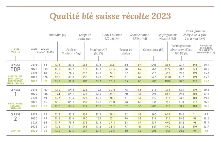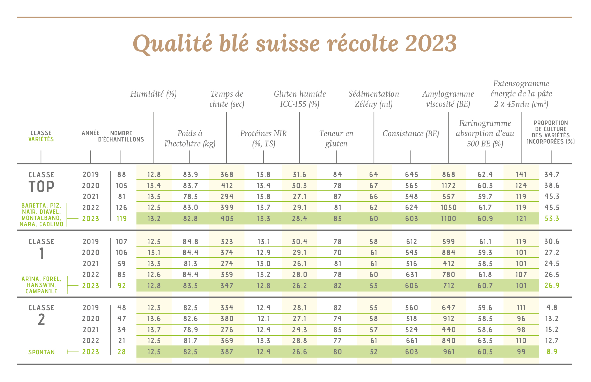 La quantité de blé panifiable est nettement plus élevée que l’année dernière et devrait se situer à peu près au niveau de la récolte de 2022. La récolte 2025 s’est déroulée dans des conditions favorables depuis les semis jusqu’à la première moitié de la période de récolte. Avec l’arrivée de conditions météorologiques humides et fraîches à partir de mi-juillet, le résultat global s’est détérioré. Il n’a plus été possible de récolter les céréales panifiables au moment optimal, ce qui a entraîné des pertes de qualité ainsi que, dans certains cas, un phénomène de germination qui a conduit à des déclassements vers le secteur fourrager. Les poids en hectolitres sont supérieurs à ceux de la récolte 2024, et la teneur en protéines est elle aussi satisfaisante. Seuls les temps de chute sont plus bas que l’année précédente dans quelques régions. Dans quelques régions également, la présence d’ergot a été détectée aussi bien dans le seigle que dans le blé panifiable. La présence de fusarium, en revanche, est restée faible. Le bilan du seigle et de l’épeautre dans la production globale de céréales panifiables n’est pas encore disponible.