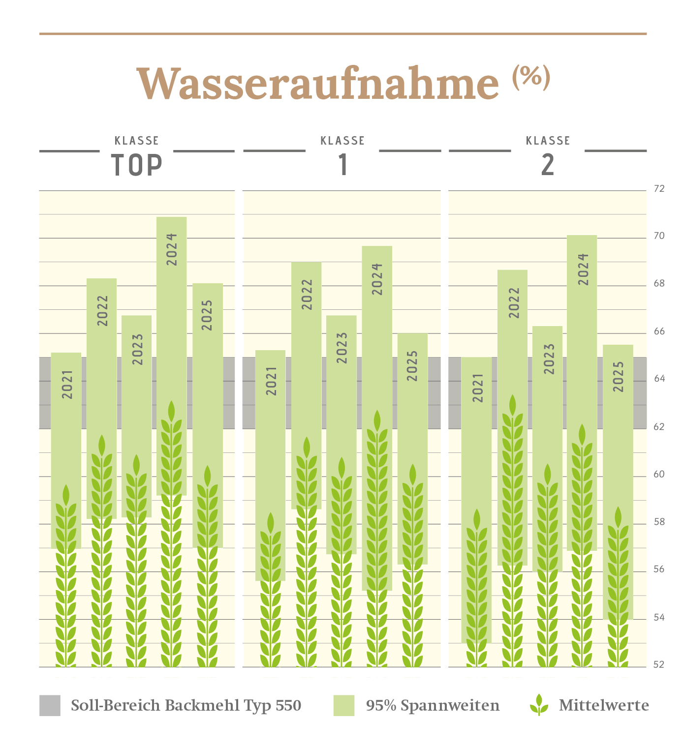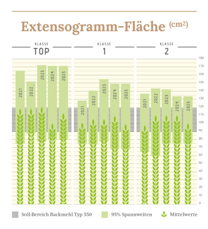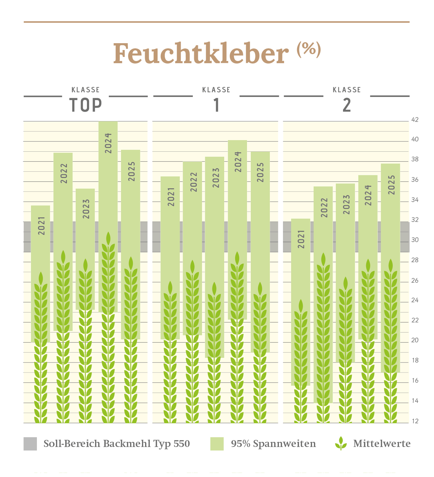 Proteinkomplex: Anhang 1 zeigt den Vergleich der Ernten 2021–2025 in Relation zu den mit den Standardkunden vereinbarten Spezifikationswerten anhand der wichtigsten Qualitätsmerkmale von Weizen. Im Gegensatz zur Erntequalität, die sich naturgemäss bei allen Merkmalen von Ernte zu Ernte ändern kann, bleiben die jeweiligen Sollbereiche über die Jahre hinweg gleich, da die Bäckereien eine konstante Mehlqualität fordern.
