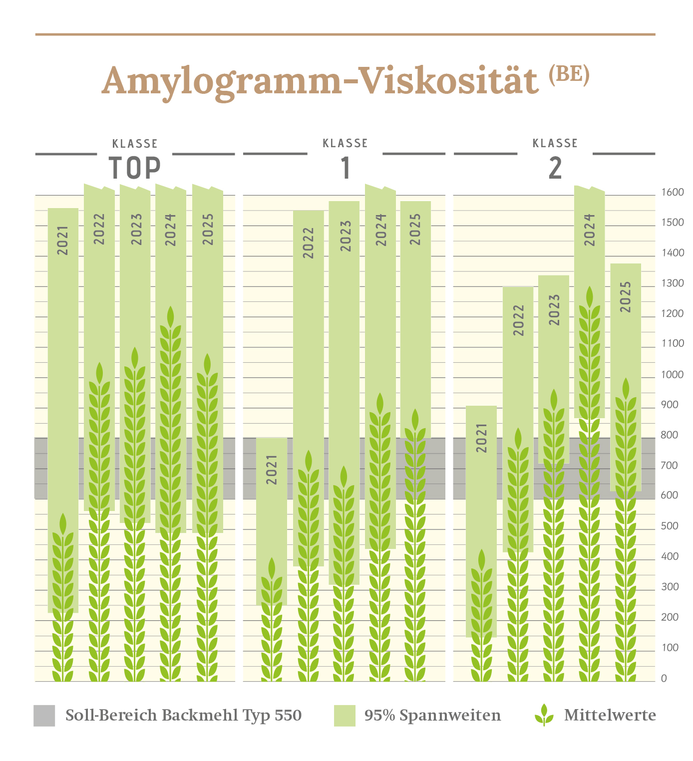 Stärkekomplex: Backmehlen wird eine optimale Amylaseaktivität zugeschrieben, wenn sie eine Viskosität von 500 bis 800 AE aufweisen. Gemäss der Ernteerhebung wird der mahlfähige Weizen der Ernte 2025 wiederum Mehle mit deutlich geringerer Amylaseaktivität (d. h. höherer Viskosität) ergeben. Die Viskosität liegt für die Klasse Top bei 1083 AE, für die Klasse 1 bei 897 AE und für die Klasse 2 bei 1004 AE. Durch die Zugabe von aktivem Malzmehl können die Mehle jedoch in Richtung des erwähnten Optimums eingestellt werden. Hierzu dient die Ernte 2023 als Referenz.
